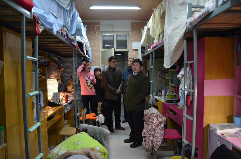 为了推进平安学校建设,维护师生安全,12月23日,后勤管理服务中心主任龚培生、党总支书记王建强、副总经理张明俊在人力资源与质量检查部、物业服务中心、饮食服务中心等相关部门负责人的陪同下,到学生公寓、餐厅进行全面的安全大检查。