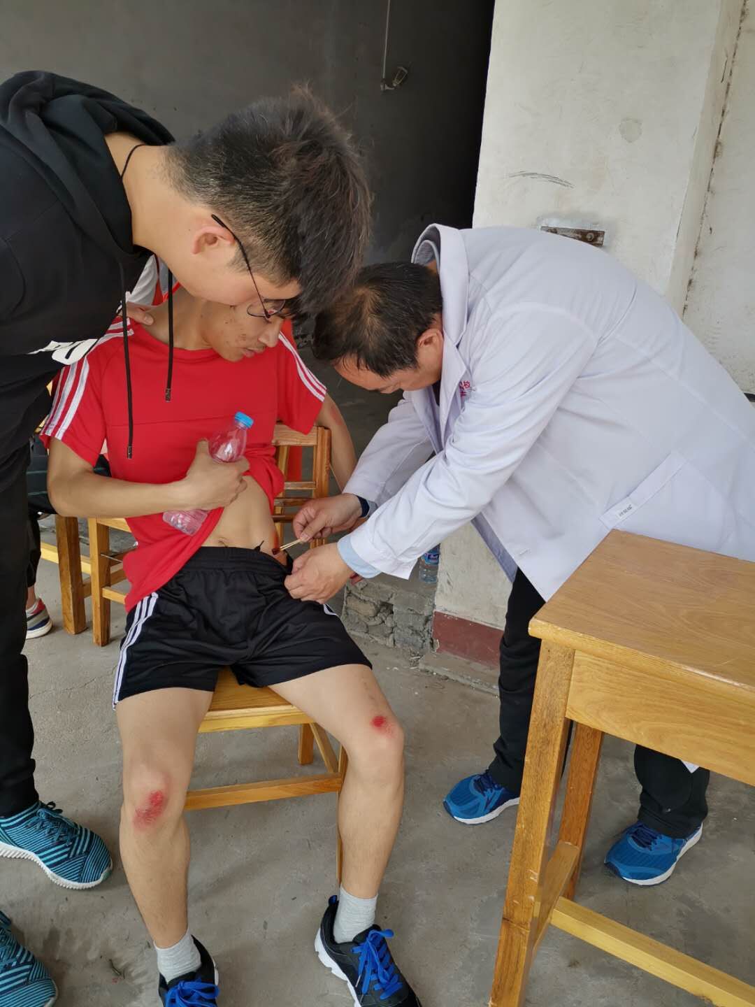 运动场上呐喊助威声此起彼伏,处处洋溢着青春,激情的气息。然而有一个特殊的团队,他们身着白大褂时刻守护在赛场入口处,那就是后勤管理服务中心的医疗保障组。他们为运动员可能出现的腹泻、各种运动损伤提供可靠保障。“酒精瓶递给我,快点拿纱布。”张颖医生耐心的为膝盖受伤的同学处理着伤口。综合科员工奔波在各个运动场馆为队员们拍照留下他们最美的瞬间,并为队员们送水。人事科通知每一位队员按时参赛。队员们在参与比赛的同时,后勤员工仍然坚守着自己服务的职责。