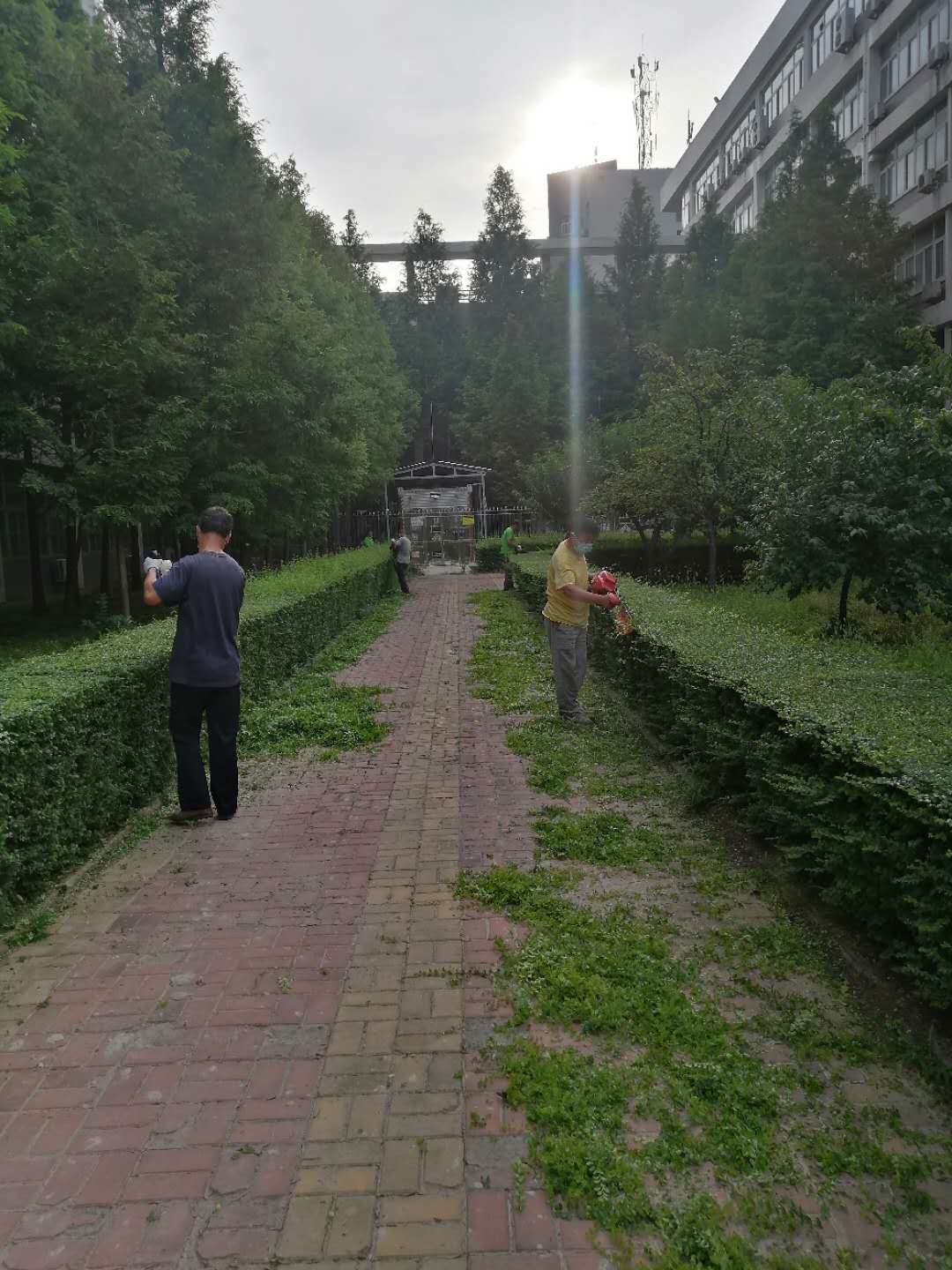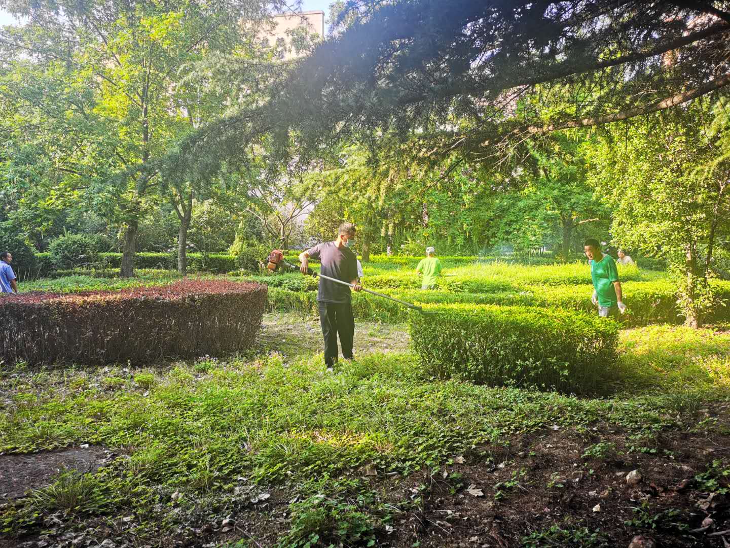 弘毅广场前——这里是后勤管理服务中心绿化科工人们每天准时“聚会”的地点。大家在队长带领下,迅速分工开始一天忙碌的工作。他们有的拿着大剪刀对树枝进行剪修,有的则提着绿蓠机清理着齐腰的花树,校园每一条校道上我们都可以看见她们晃动的身影。草花更换、草坪花园的修复、绿植的浇水施肥、绿化带内的杂草清理等都离不开他们。在烈日炙烤下,苗木很容易脱水枯死,为了保证苗木正常存活,园林绿化工人趁早晚天凉时加班作业,保证一年内新植苗木2天浇一次水,一年以上成年苗木3至5天浇一次水。炎热的三伏天里,他们头顶烈日,脚下热浪翻滚,身上汗流浃背在酷暑中用双手呵护着烈日校园下的那抹绿色。“后勤无闲月,暑期人更忙”,他们用责任测量炎夏的温度,用担当迎战烈日的灼热。正是因为他们不怕脏、不怕累,两手黑染,两脚污泥,满身尘土,一年四季的默默坚守,才使我们感受着许院校园里万紫千红的春,花繁叶茂的夏,枫红菊香的秋和白雪青松的冬。