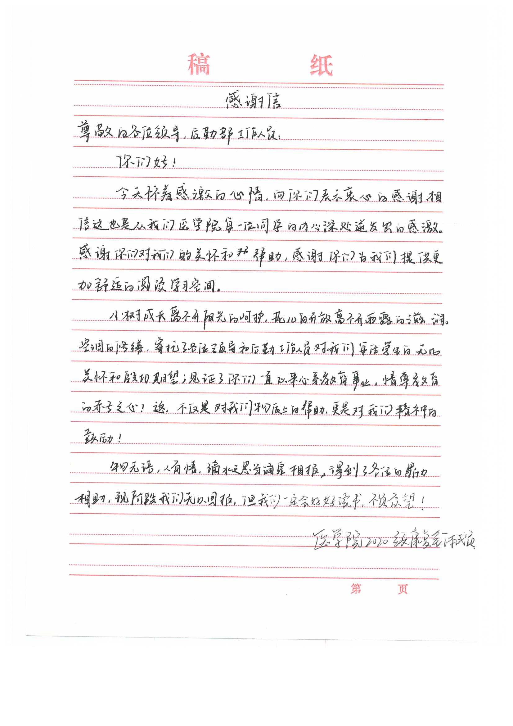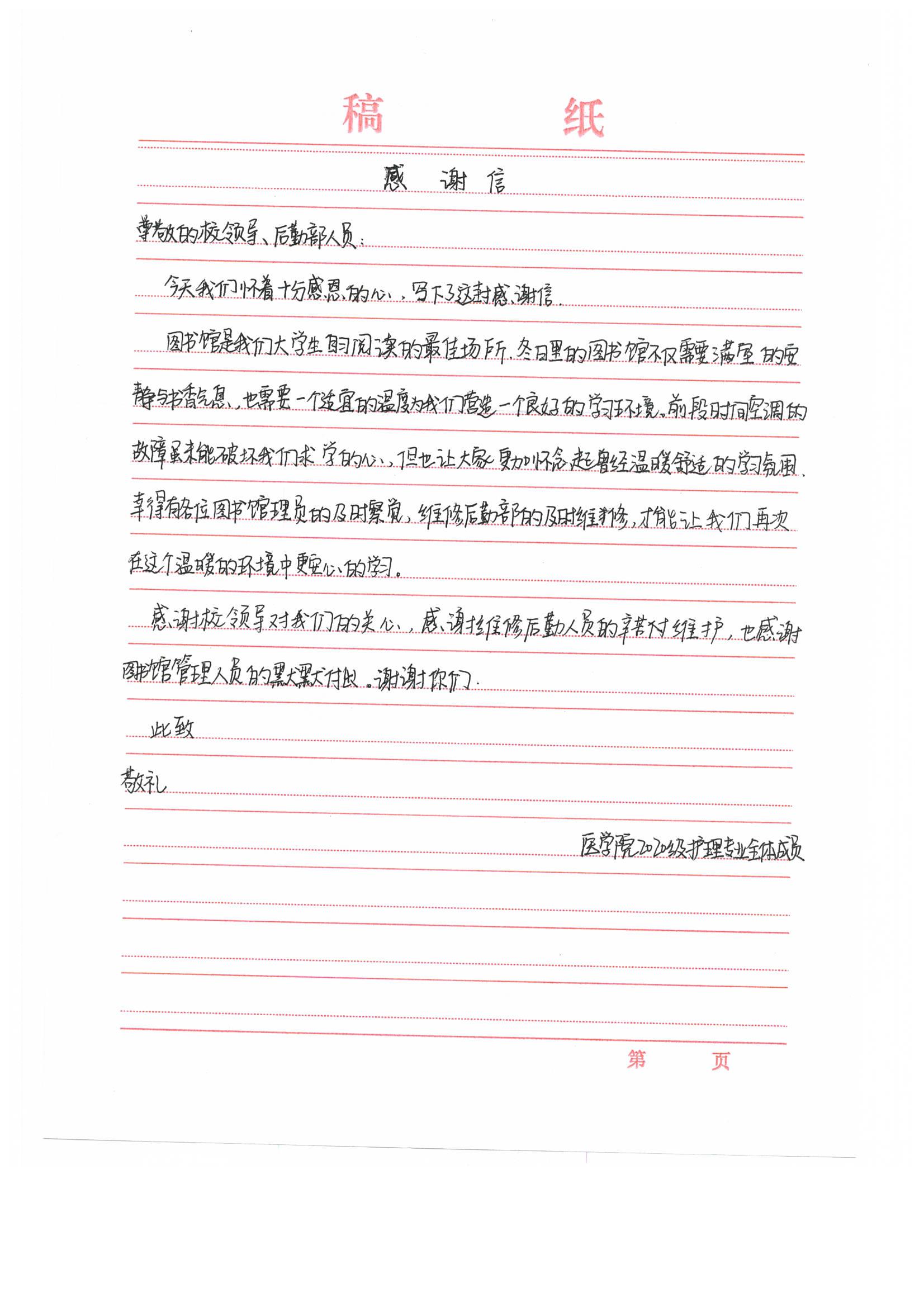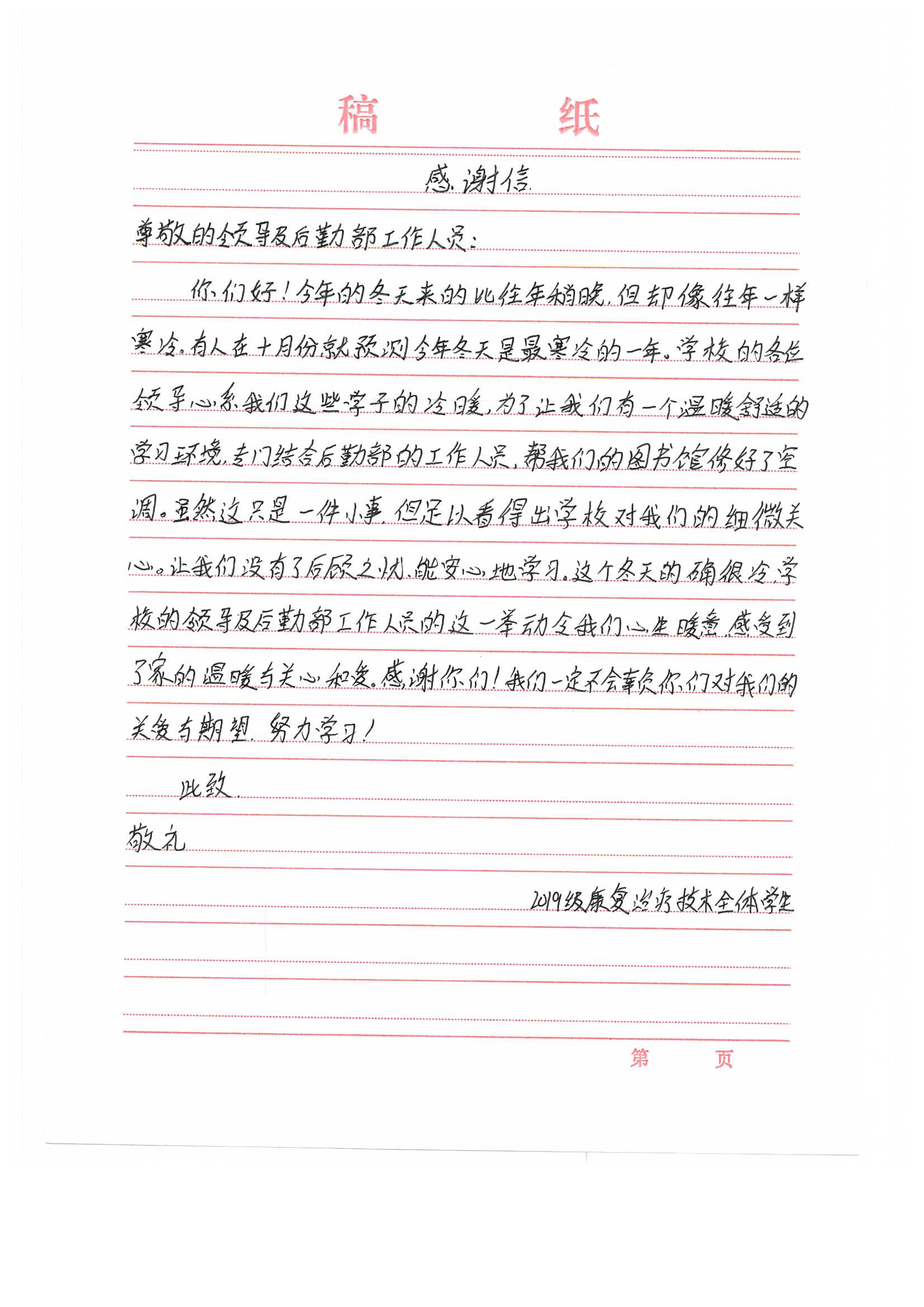 12月9日上午,后勤管理服务中心收到来自兴华校区学生14封感谢信。同学们用这样原始的方式,表达着他们深深的感激之情,感谢后勤管理服务中心及时维修图书馆空调,为同学们提供温暖的学习环境,并表示今后将不忘“后恩”,加倍努力,回报学校和社会。
