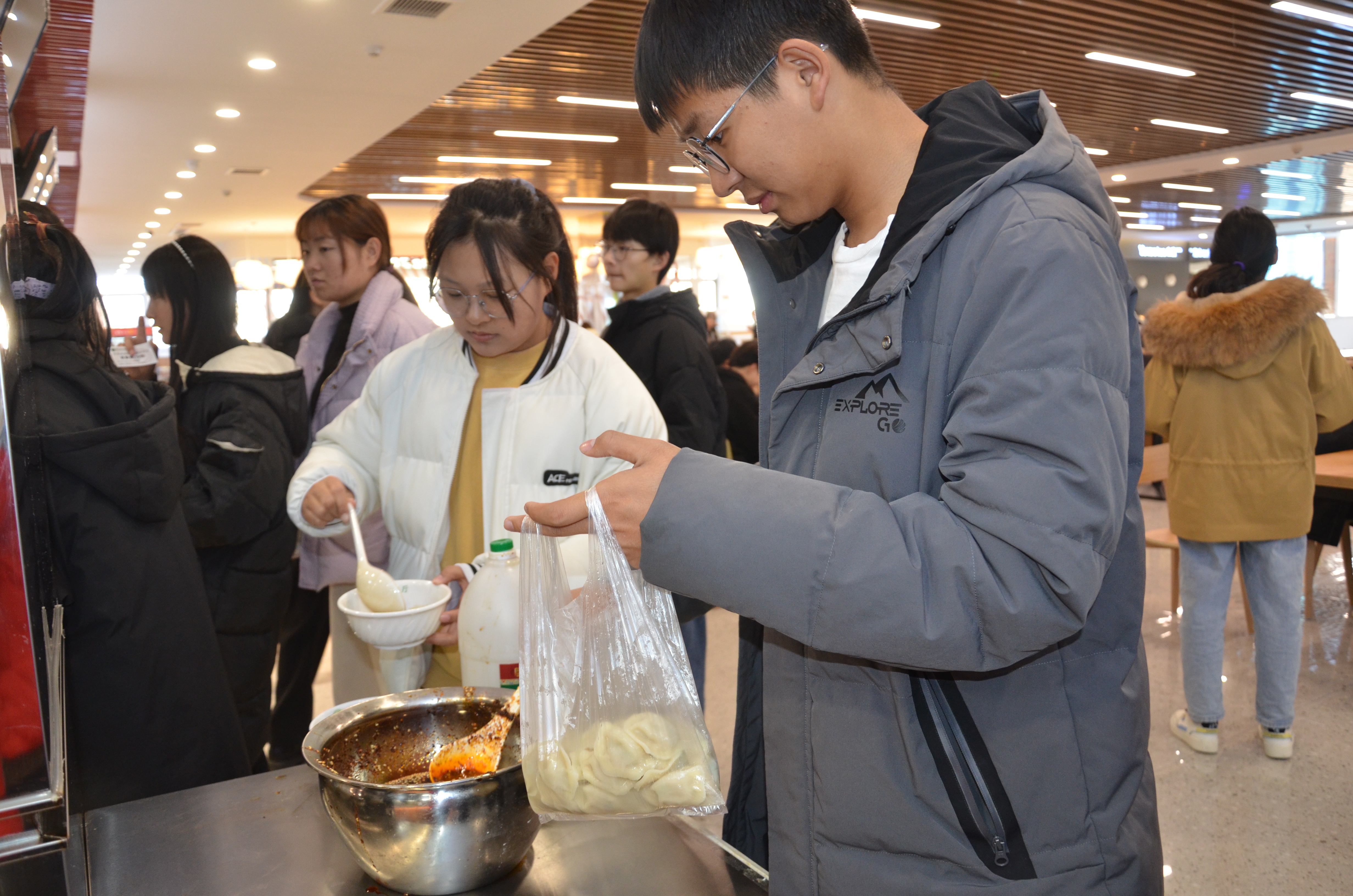“冬至送温暖,免费送饺子”活动从上午10点开始到晚上8点结束,同学和老师们在送餐窗口排起了长队。据餐厅经理韩安民介绍,为了举办好此次活动,餐饮公司提前采购思念牌速冻荤素水饺,另员工加班手工制作,特意开设六个专用窗口。饺子不但可以自己吃,同学和老师也可以打包带走一份。2020级旅游管理专业一位同学说“吃了学校送的饺子,考试都觉得有能量了,学校餐厅冬至送饺子的仪式感让我们有了家的温暖。”