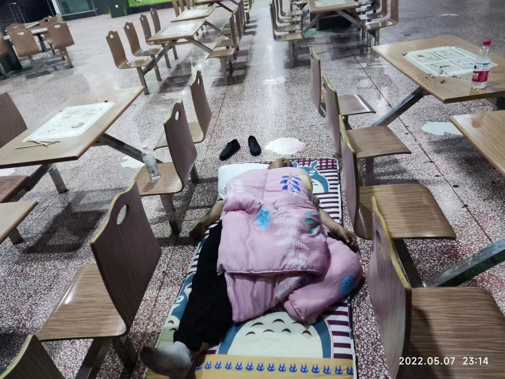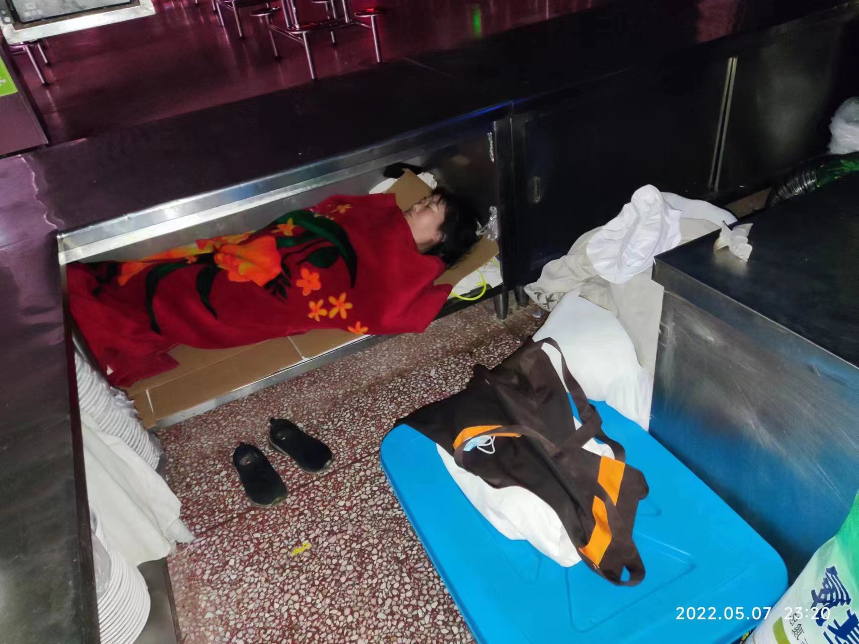 这里没有替补 食材验收、制作、配送、环境消杀、根据诉求制定后续服务措施那个环节都不能少,420位餐厅员工每餐工作时长约6个小时,每天工作时长约18个小时,累了能睡那里睡那里,车上,橱柜下面,餐厅过道里……前三天,哪怕睡四个小时也算是件幸福的事情,长时间超负荷劳动,他们双目通红,声音沙哑,他们说太累了不想说话,更没有时间接受新闻访谈。