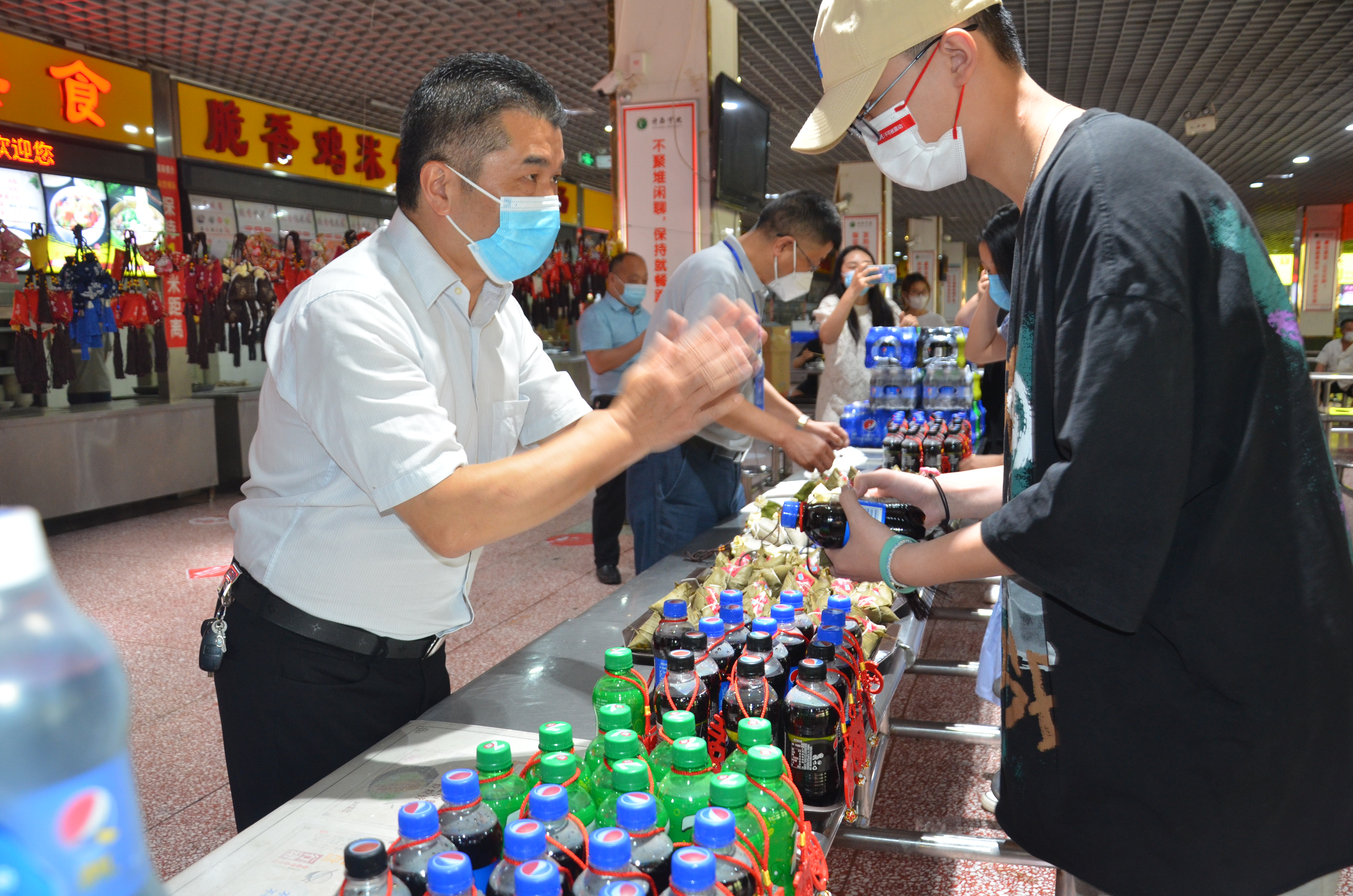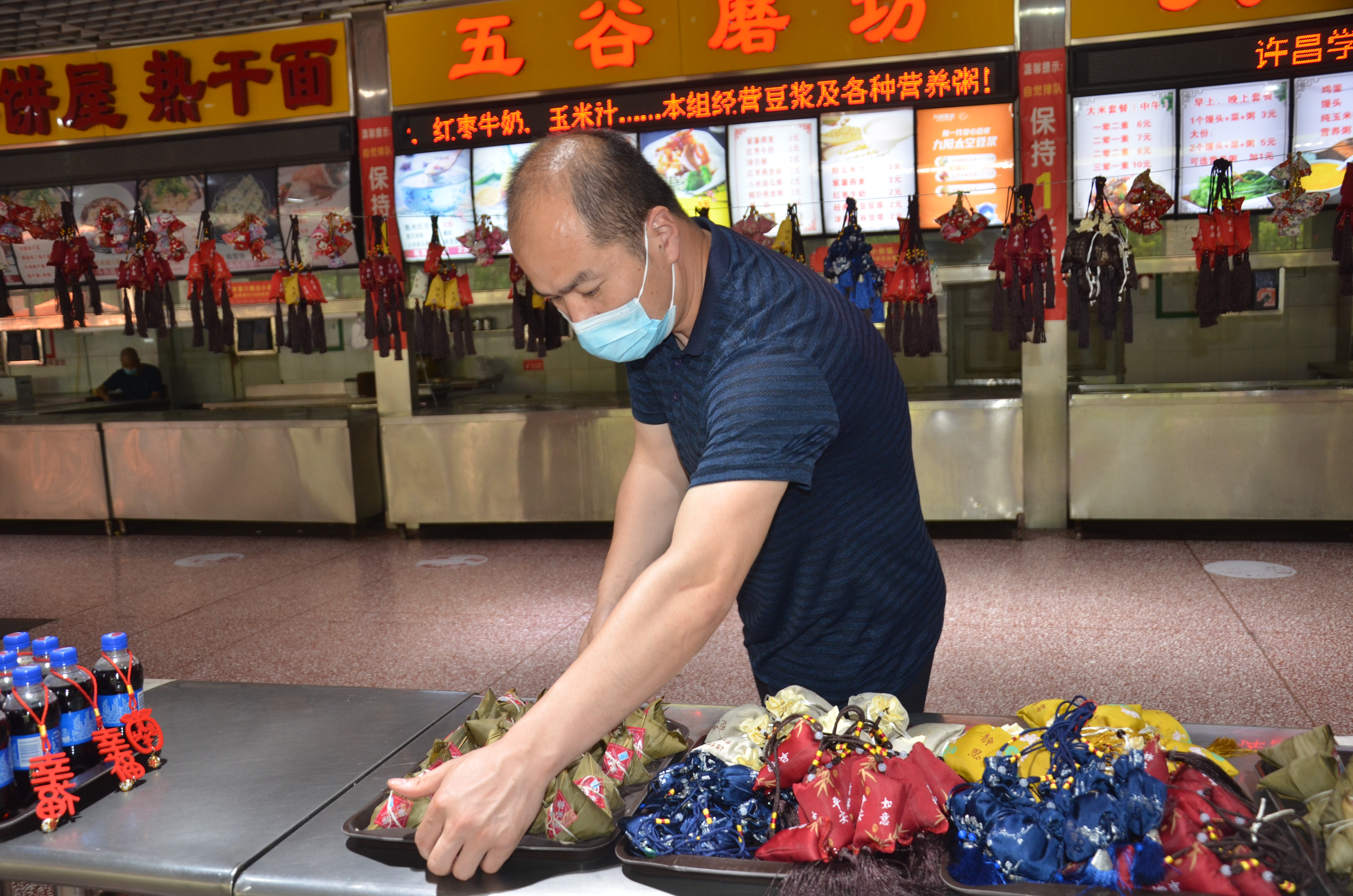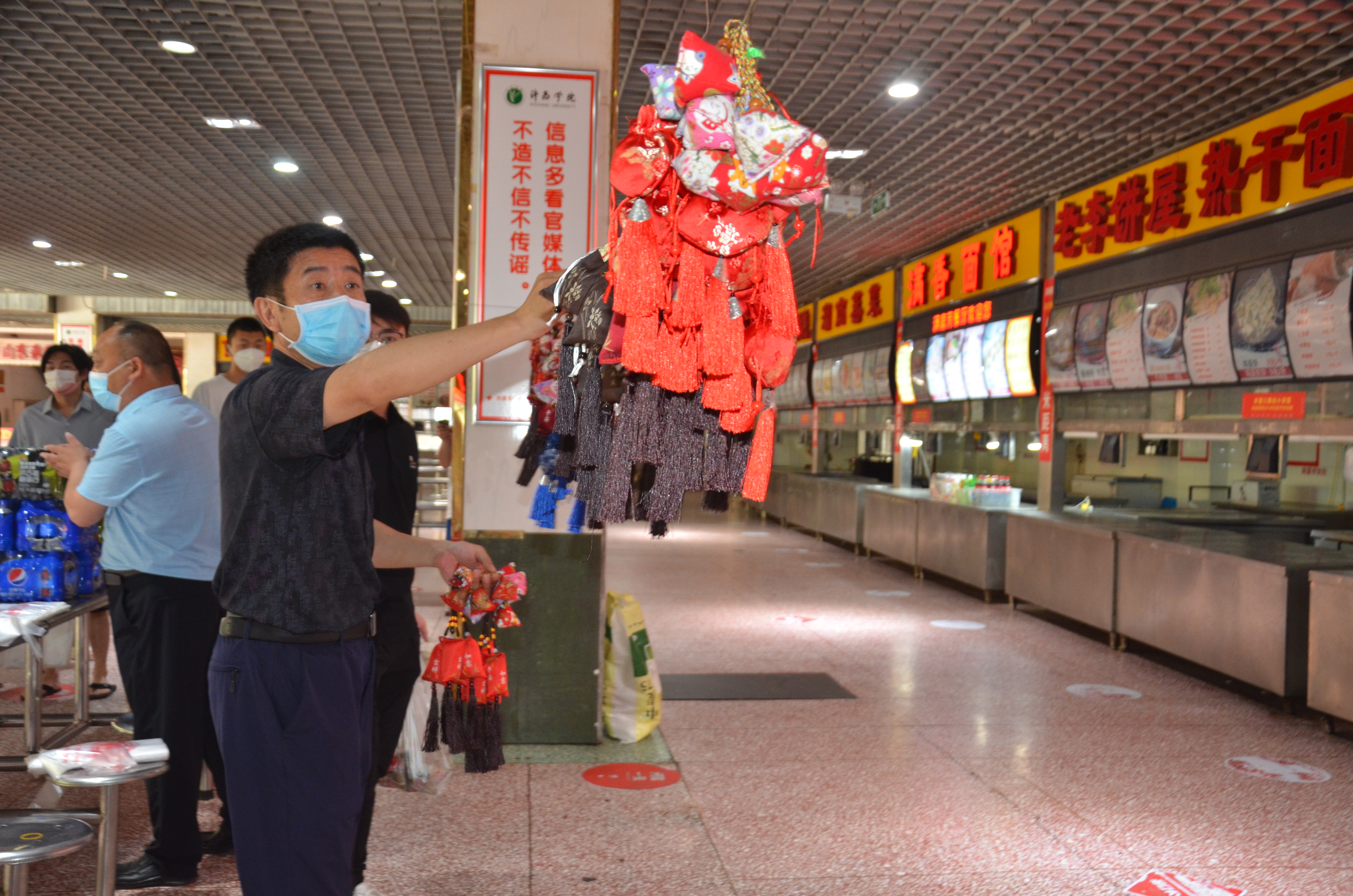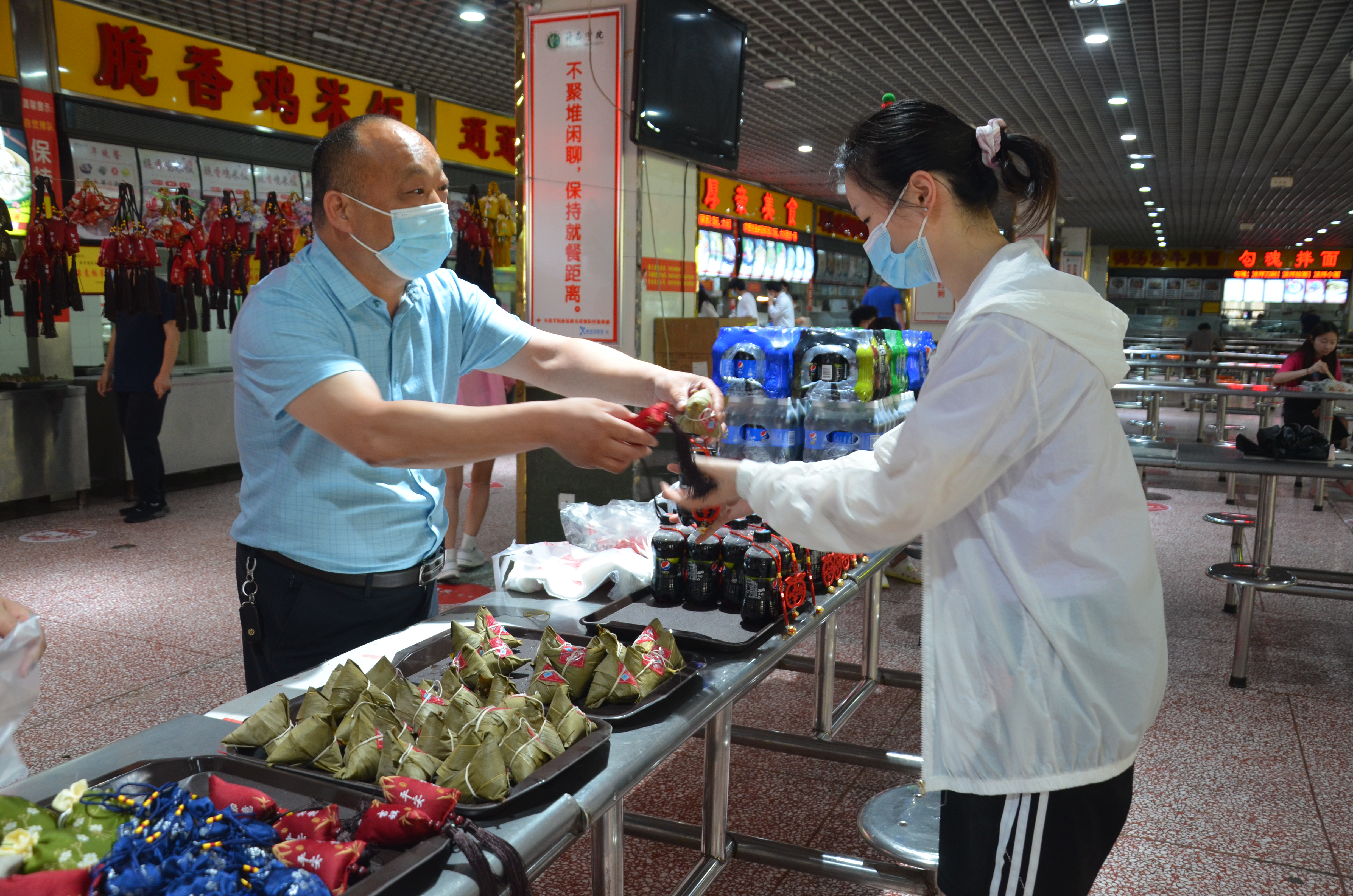 满庭芳餐厅大厅中央悬挂着五彩斑斓的香囊,热气腾腾的粽子摆放在特供窗口,中午11时,后勤管理服务中心党委书记李文东和主任刘军伟来到满庭芳餐厅,为在校迎考的考生们发粽子和香囊,并祝愿同学们心想事成,金榜题名奔赴好前程。领取现场井然有序,同学们欣赏着香囊,脸上洋溢着幸福的笑脸。国教宋文辉同学说“感谢后勤老师们在百忙之中为大家准备的节日祝福,我们一定不辜负老师们的祝福,全力以赴迎接考试。”