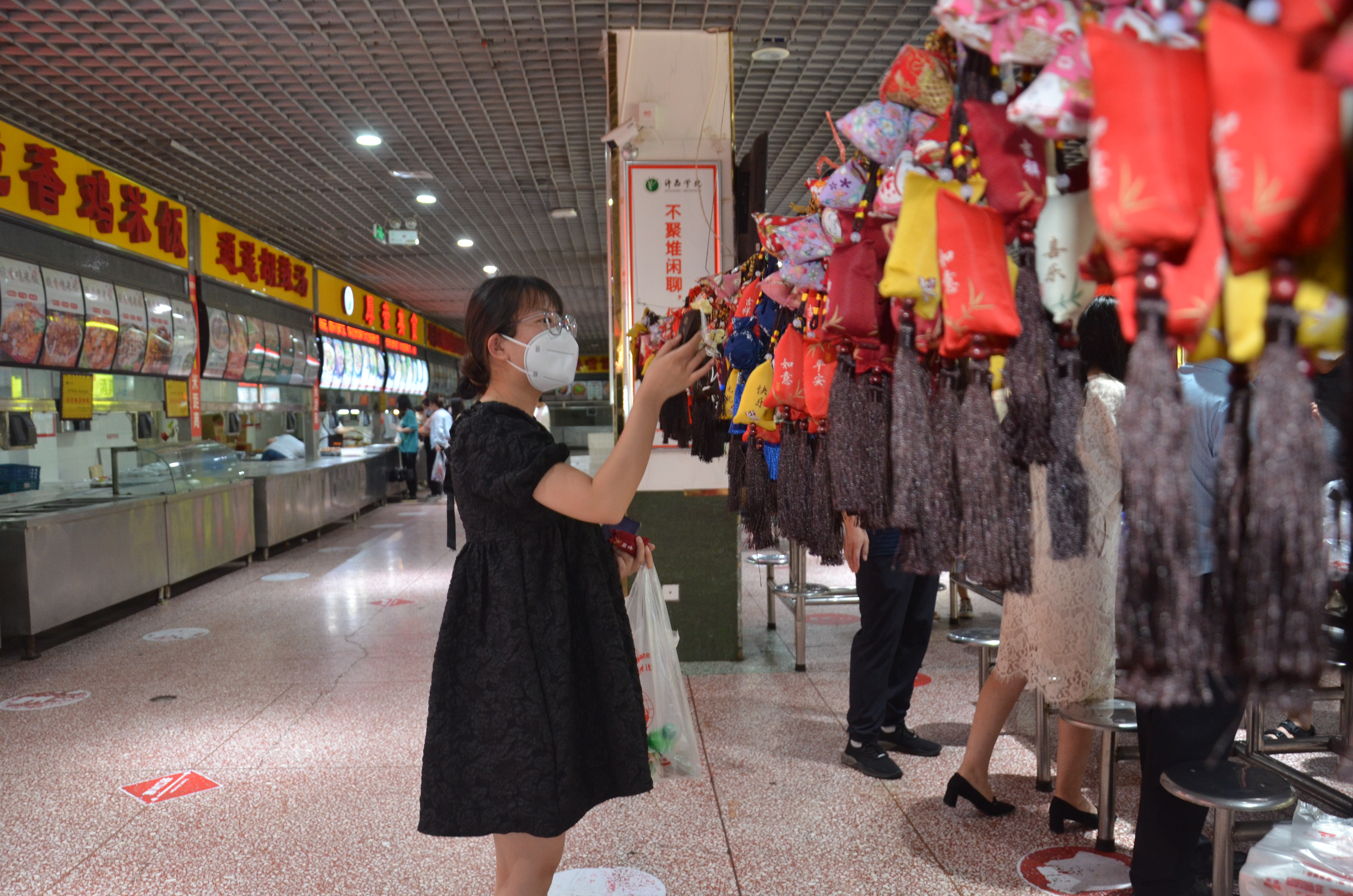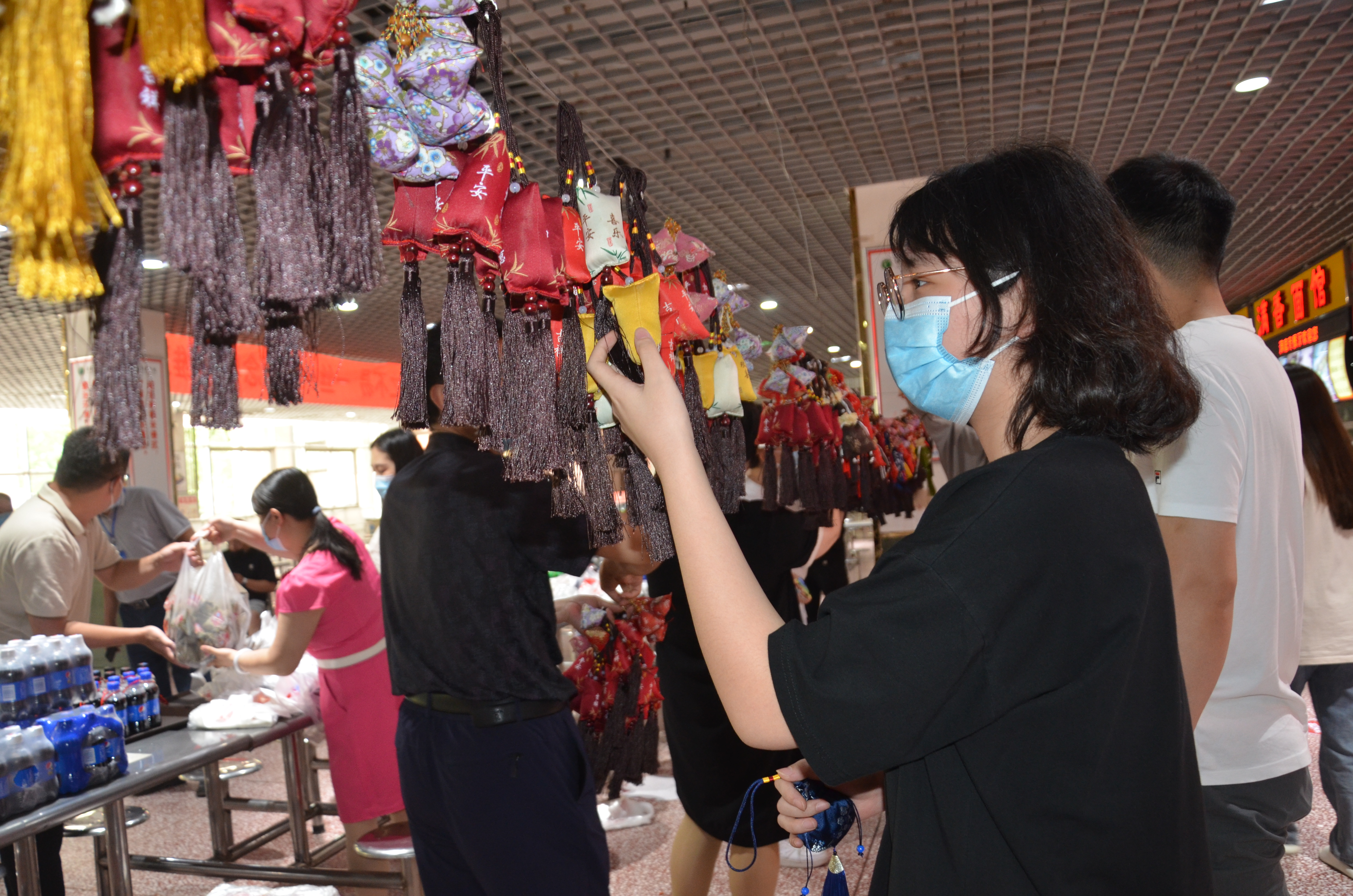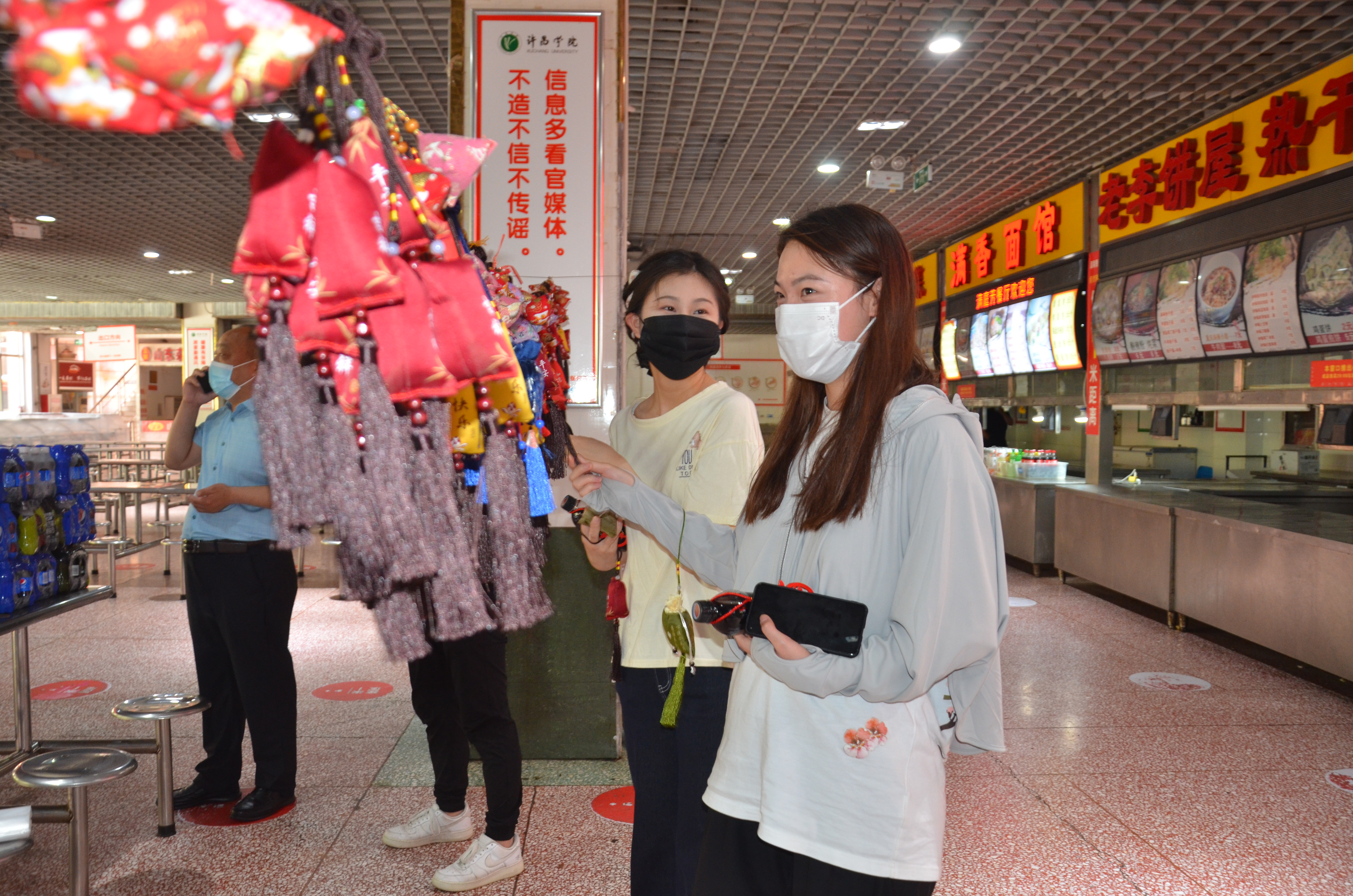 满庭芳餐厅大厅中央悬挂着五彩斑斓的香囊,热气腾腾的粽子摆放在特供窗口,中午11时,后勤管理服务中心党委书记李文东和主任刘军伟来到满庭芳餐厅,为在校迎考的考生们发粽子和香囊,并祝愿同学们心想事成,金榜题名奔赴好前程。领取现场井然有序,同学们欣赏着香囊,脸上洋溢着幸福的笑脸。国教宋文辉同学说“感谢后勤老师们在百忙之中为大家准备的节日祝福,我们一定不辜负老师们的祝福,全力以赴迎接考试。”