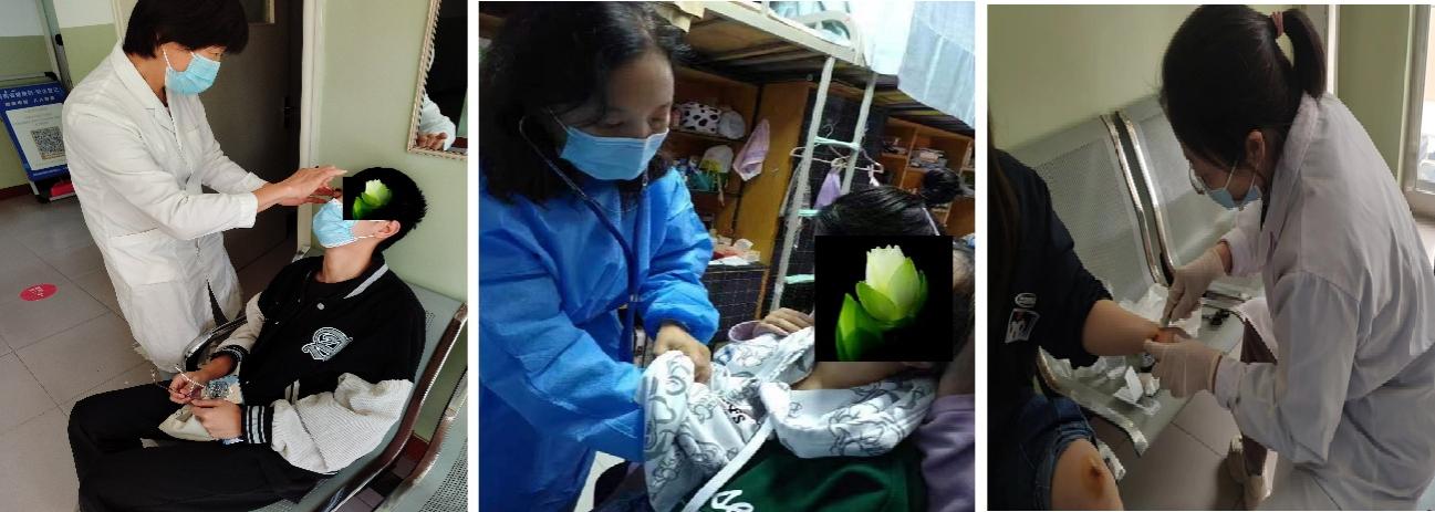 校医院校内感染、传播风险最高。分诊、就诊、取药、转诊等环节都存在风险,任何一点工作疏漏都有病毒传播的可能,医护人员一经上岗思想就需要保持高度集中和警惕,尤其是技术上每个环节,都要一丝不苟,同时还要克服专业技术人员不足、过度疲劳等因素干扰,尽量避免失误。除了白天正常的医疗卫生工作外,一些急诊、发热需要转诊、电话求救等病例在夜间不同时段出现。为保一方安宁,大家秉着“宁可十防九空,绝不可失防万一” 的精神,执甲前行。