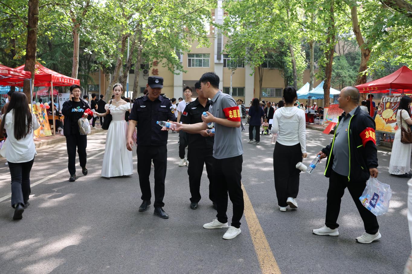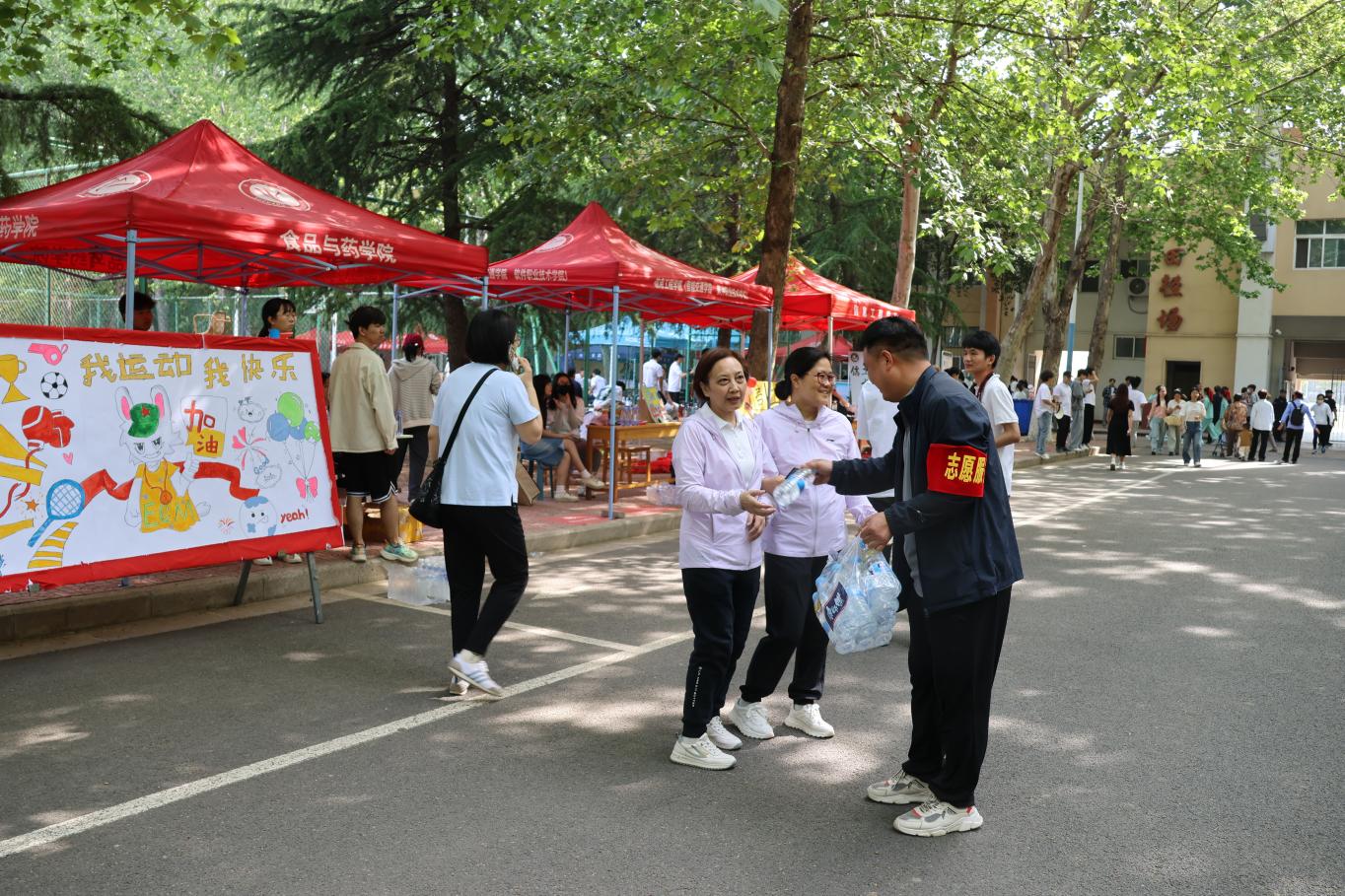 羽飞田径场门前,由后勤管理服务中心党员们用2万余瓶矿泉水搭建的奋进号航母造型吸引了过往的师生,大家为师生发放免费小零食,为运动健儿们递上矿泉水、小饼干等为运动健儿补能充“电”,加“油”鼓劲。