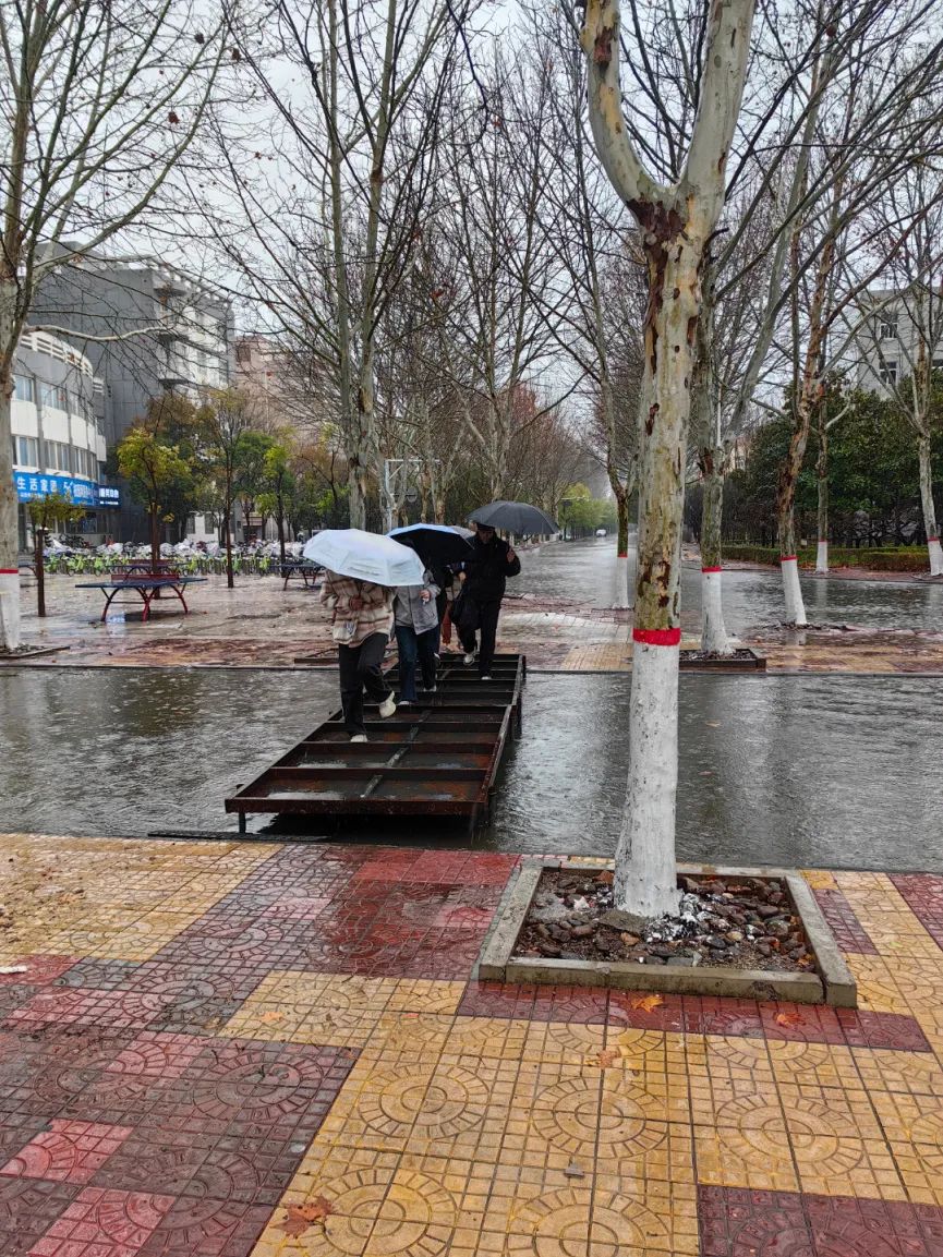 学生餐厅全力保障师生用餐由于持续强降雨,学生餐厅周边积水严重,师生通行受阻。为保障用餐秩序,膳食科迅速在各餐厅入口处搭建临时浮桥,并安排专人值守,确保师生安全、便捷地进入餐厅用餐。查看疏通确保排水畅通校本部楼寓管理科和兴华路校区总务科为防止楼顶积水引发渗漏或其他安全隐患,冒雨对全校楼顶的下水口进行了全面检查与疏通。工作人员逐一清理堵塞的排水口,确保雨水能够顺利排出,避免楼顶积水对建筑造成损害。经过及时疏通,所有楼顶排水系统运行正常,未出现积水现象。