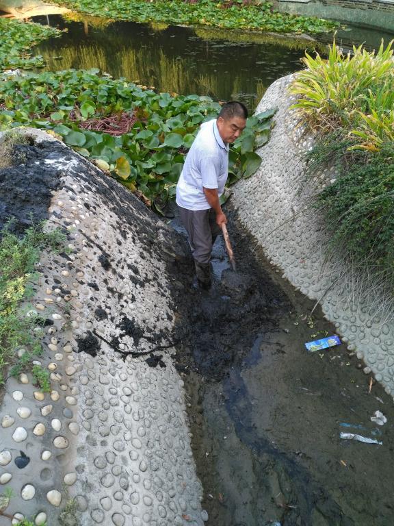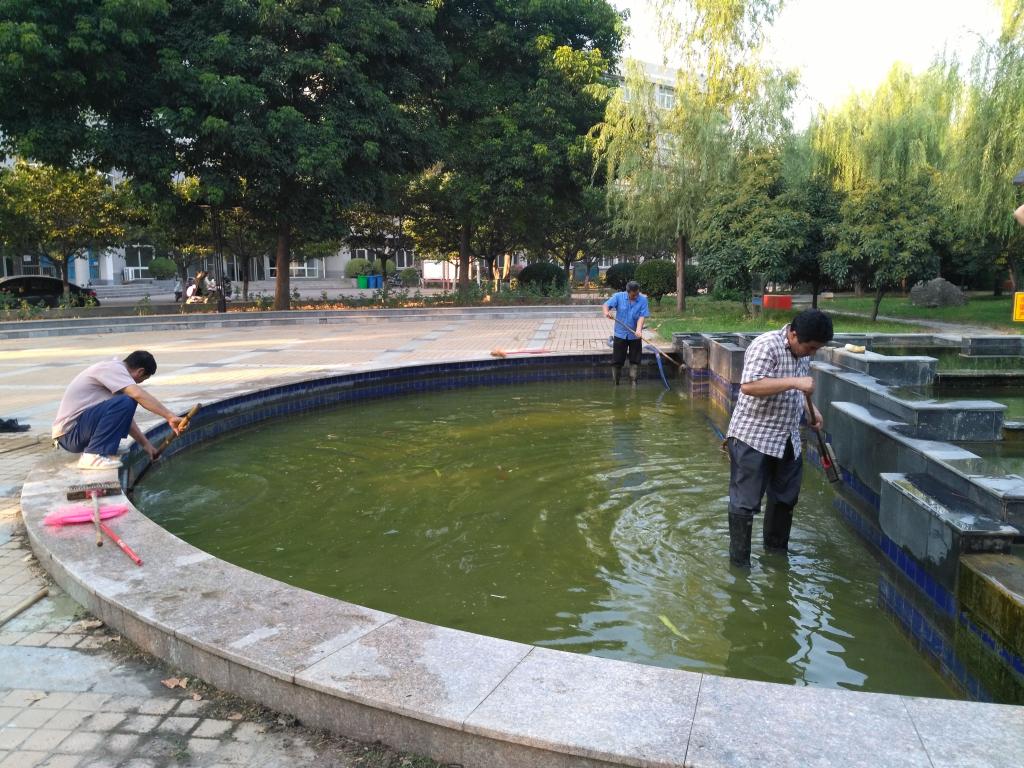 为迎接新生到来,物业服务公司经理韩慧丽带领一组维修工负责清理溢智苑一景观水池,由于长时间没有清理,水池内的水已经发臭了。维修工现将水池四周用毛刷刷洗干净,用水泵把池内脏水抽出,最后将池内污物清理干净再放水。旁边莲花池内淤泥把入水口堵塞了,师傅们穿着胶鞋站在半米深的淤泥里把淤泥清理干净,景观池工作完成已经是晚上10点了。